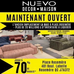 NUEVO Décor Maison a officiellement ouvert ses portes à Place Rosemère. Plus de 20 M$ d’inventaire à liquider avec des rabais allant jusqu’à 70 % sur les catégories clés pour la maison : cuisine, chambre, salon et décoration.
